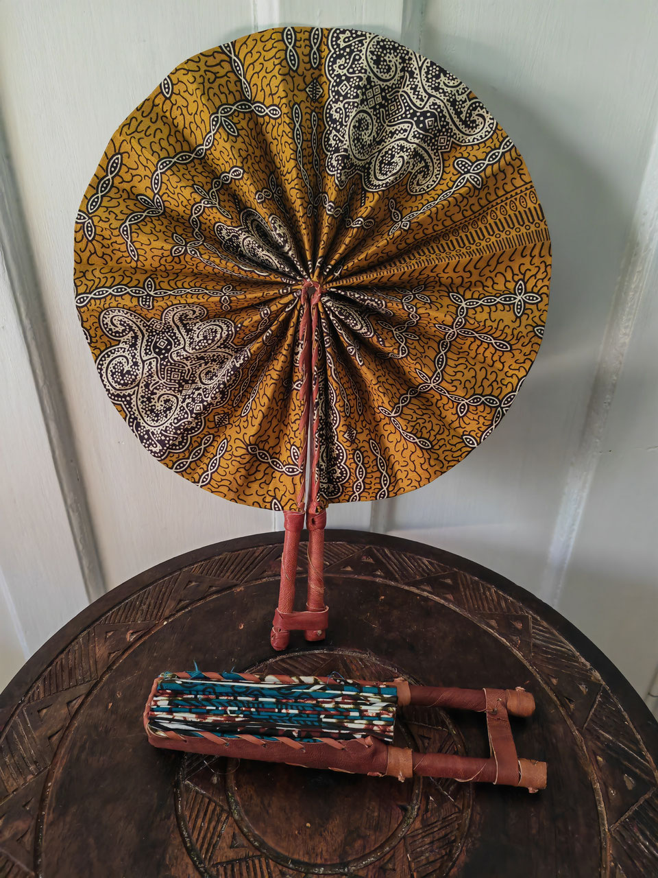 Handfächer aus afrikanischem Wachsdruckstoff, senf/braun/weiß, zusammenklappbar, 30cm Durchmesser.