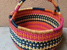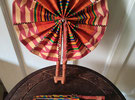 Klappfächer aus afrikanischem Stoff mit rotem Kentemuster. Durchmesser aufgeklappt 30cm. Länge des zusammengeklappten Fächers 23cm.